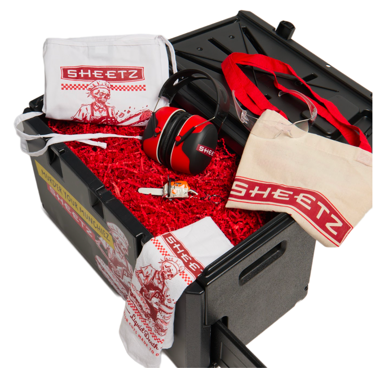 Sheetz x Liquid Death merchandise was sold at the event including branded t-shirts, hats, safety glasses, and aprons.